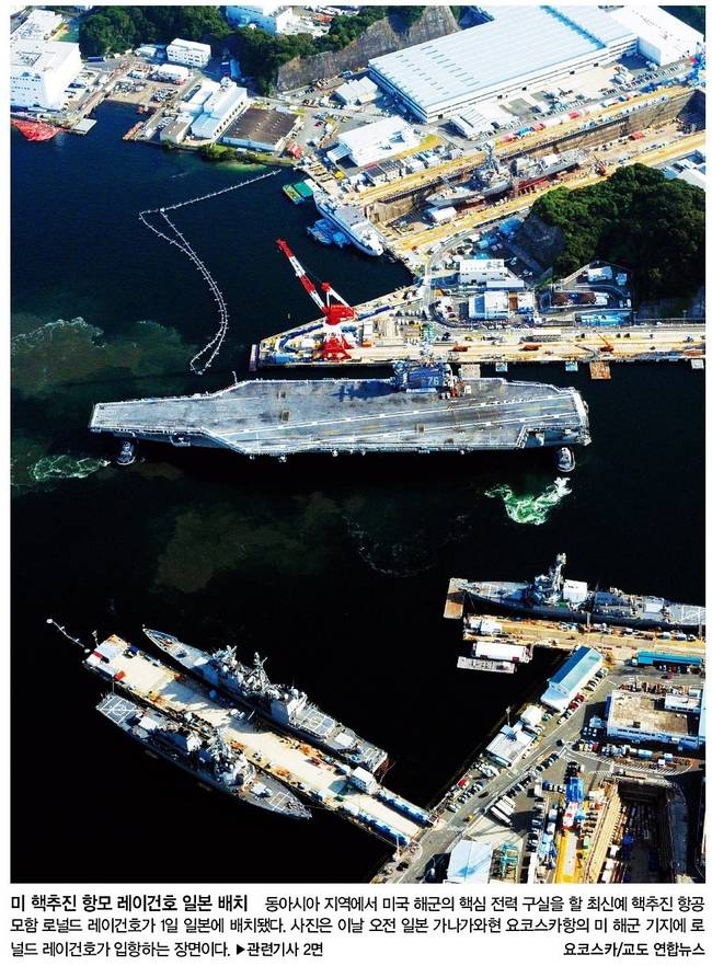 한겨레는 동아시아 지역에서 미국 해군의 핵심 전력 구실을 할 최신예 핵추진 항공모함 로널드 레이건호가 일본 미 해군 기지로 입항하는 장면을 1면 사진으로 실었다.