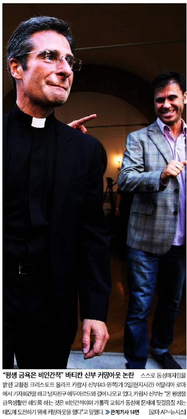 중앙일보는 3일 시노드를 앞두고 스스로 동성애자임을 밝힌 교황청 크리스토프 올라프 카람시 신부가 커밍아웃 기자회견을 하고 걸어나오는 모습을 전면에 내세웠다. 중앙일보는 사진설명에서 “카람사 신부는 ‘온 평생을 금욕생활만 하도록 하는 것은 비인간적이며 가톨릭 교회가 동성애 문제에 뒷걸음질 치는 태도에 도전하기 위해 커밍아웃을 했다’고 말했다”고 전했다.
