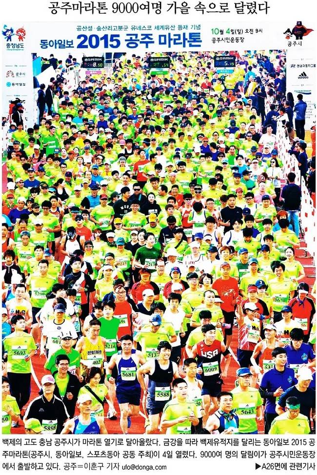 동아일보는 ‘2015 공주마라톤’ 대회 참가자들이 출발하는 모습을 1면 사진으로 선택했다. 동아일보는 사진설명에서 “금강을 따라 백제유적지를 달리는 동아일보 2015공주마라톤(공주시, 동아일보, 스포츠동아 공동 주최)이 4일 열렸다”며 “9000여 명의 달림이가 공주시민운동장에서 출발하고 있다”고 전했다. 동아일보는 관련 기사에서 마라톤 대회 우승자들의 사연을 자세히 소개했다.