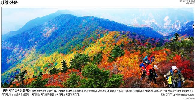 경향신문은 단풍이 들기 시작한 설악산을 찾은 등산객들이 끝청봉에 오르는 모습을 지면에 담았다. 경향신문은 사진설명에서 “끝청봉은 설악산 대청봉·중청봉에서 서쪽으로 이어지는 곳에 자리잡은 해발 1604m 봉우리이다. 정부는 오색 탐방로에서 시작되는 케이블카를 끝청봉까지 설치할 계획”이라고 보도했다.