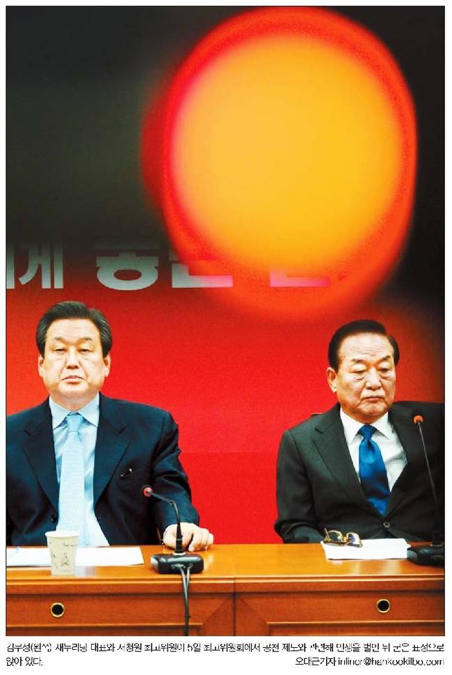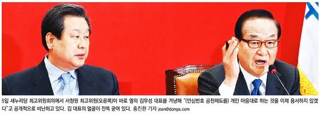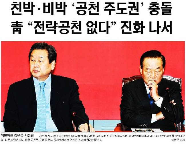 국민일보는 김무성 대표와 서청원 최고위원이 5일 국회 당대표실에서 열린 최고위원회의에서 굳은 표정으로 서로를 외면하는 모습을 1면에 담았다. 국민일보는 관련기사에서 “서 최고위원은 국회에서 열린 최고위원회의에서 김 대표가 ‘우선추천지역’은 수용할 수 있다는 의사를 한 언론에 밝힌 것에 대해 ‘당 대표가 떡 주무르듯 당헌·당규를 마음대로 할 수 있다는 표현 자체가 잘못된 것’이라고 직격탄을 날렸다. 그는 이어 ‘나는 참고 있다. 청와대도 참고 있다. (김 대표가) 쓸데없는 것을 부각해 긁어 부스럼을 만들고 있는데 이제는 용서하지 않겠다’고 경고했다”고 전했다.