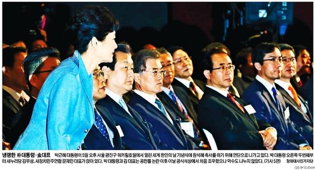 새누리당 김무성 대표와 서청원 최고위원이 5일 최고위원회의에서 정면충돌했다. 공천 룰을 둘러싼 새누리당 내 친박-비박계 갈등이 폭발한 것이다. 이날 오후 박근혜 대통령과 김무성 대표는 공천 룰 논란 이후 공식석상에서 처음 조우했으나 악수도 나누지 않은 채 냉랭한 분위기를 유지했다. 6일 다수의 주요 일간지들은 이 같은 소식을 담은 사진을 1면에 걸었다.