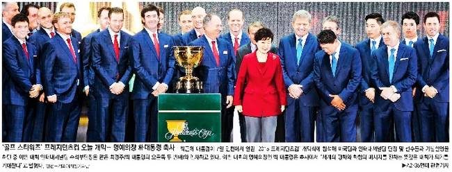 동아일보는 7일 인천에서 열린 ‘2015 프레지던츠컵’ 개막식에서 박근혜 대통령과 미국과 인터내셔널팀 단장 및 선수들이 기념촬영을 하고 있는 모습을 1면 사진으로 선택했다. 동아일보는 관련기사에서 “‘필드의 별들’이 2015 프레지던츠컵을 위해 총출동한 인천 잭니클라우스골프클럽은 연습 라운드부터 뜨거운 열기에 휩싸였다”면서 “대회 관계자는 ‘6일부터 이틀간 연습라운드에 구름관중이 몰린 데 이어 공식경기가 열리는 8일부터 11일까지는 하루 평균 2만5000명이 클럽을 찾을 것으로 예상된다’고 말했다”고 전했다.