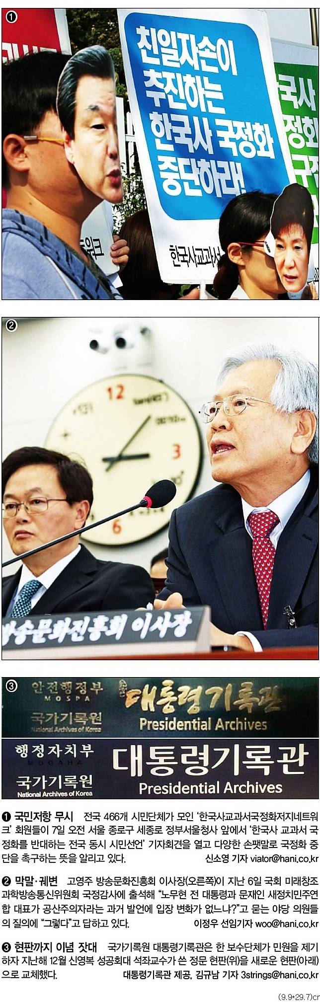 한겨레신문은 관련기사에서 “정부와 여당이 ‘역사교과서 국정화’에 대한 강력한 저항과 반대여론을 무시한 채 국정교과서 도입을 강행하는 쪽으로 사실상 가닥을 잡았다”며 “교육부는 이르면 오는 12~13일께 국정화를 발표할 것으로 보인다”고 게재했다. 이어 “역사교과서 국정화는 ‘세계적 흐름에 역행하는 퇴행적 발상’이라는 비판이 나온다”고 덧붙였다.