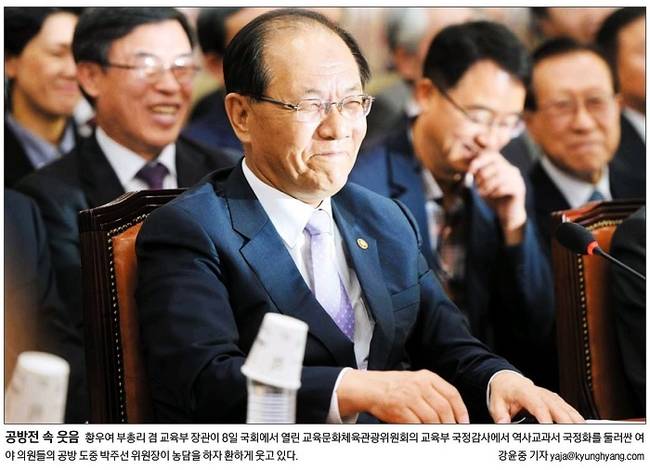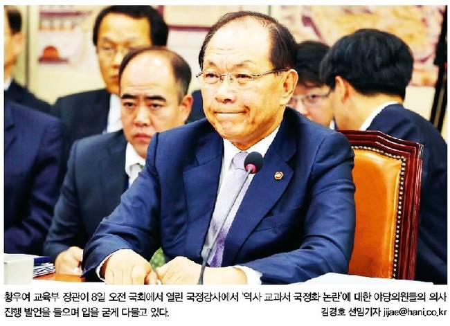 경향신문은 국회 교육문화체육관광위원회의 교육부 국정감사에 출석한 황우여 부총리 겸 교육부 장관의 모습을 1면 사진으로 선택했다. 경향신문은 관련기사에서 “여야가 국정감사 마지막 날인 8일 국회 교육문화체육관광위원회의 교육부 국감에서 정부·여당이 추진 중인 역사교과서 국정화를 두고 정면충돌했다”며 “야당은 ‘정기국회 보이콧’까지 거론하며 전면전을 선포했고 여당은 정부를 적극 지원하고 나서 ‘역사교과서 국정화’대립이 정국 최대쟁점으로 떠올랐다”고 전했다.