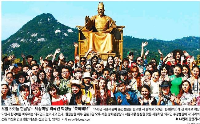 569돌 한글날을 맞아 관련 보도도 잇따랐다. 동아일보는 한글날을 하루 앞둔 8일 서울 광화문 광장을 찾은 세종학당 외국인 학생들의 모습을 대문사진으로 선택했다. 동아일보는 한글날 관련 보도에서 중국 관광지의 엉터리 한글 안내에 대해 지적했다. 동아일보는 “569돌 한글날을 맞아 해외에서 잘못 쓰인 한글 표지판 등에 대한 수정이 필요하다는 지적이 나오고 있다”며 "이 같은 오류는 주요 관광지에서 표지판 등에 한글을 병기하고 있는 중국에서 많이 발견되고 있다“고 보도했다. 이어 ”중국에서 한글 오류 표기가 많은 것은 지방정부나 개인이 중국어를 구글 번역기 등을 사용해 한국어로 번역한 뒤 그대로 사용하고 있기 때문“이라고 설명했다.