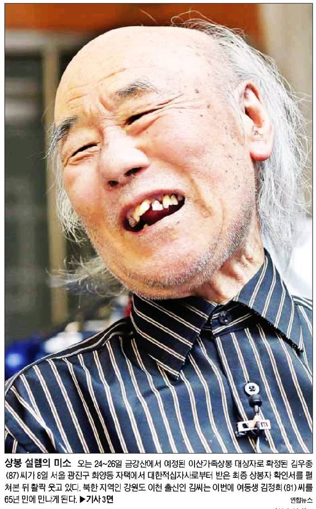 서울신문은 오는 24~26일 금강산에서 예정된 이산가족상봉 대상자로 확정된 김우종 씨가 항봉 확인서를 받고 활짝 웃는 모습을 1면 사진으로 선택했다. 서울신문은 관련기사에서 “남과 북이 8일 이산가족 상봉자 최종 명단을 교환했다”며 “남북은 각각 90명, 97명의 명단을 교환했다”고 전했다. 이어 “1차 상봉단은 20~22일, 2차 상봉단은 24~26일 각각 가족을 만난다”고 덧붙였다.