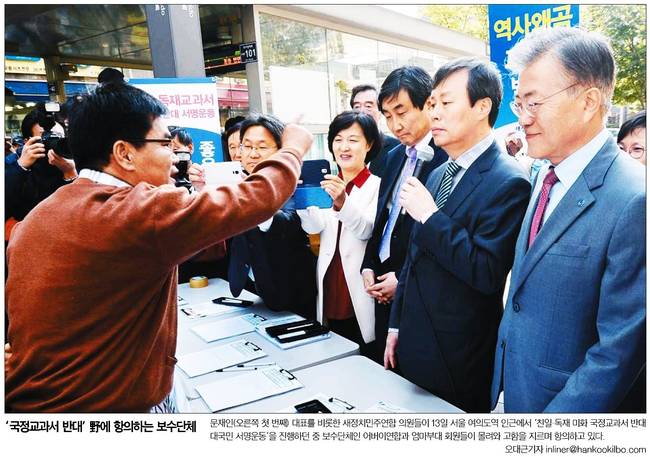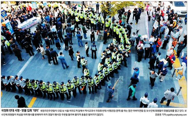 경향신문은 새정치민주연합이 13일 낮 서울 여의도역 앞에서 역사교과서 국정화 반대 서명운동을 진행하는 동안 어버이연합 등 보수단체 회원들이 맞불 집회를 여는 모습을 1면 사진으로 담았다. 경향신문은 "박 대통령은 "올바른 역사교육 정상화를 이뤄서 국민 통합의 계기가 될 수 있도록 함께 노력해주시면 감사하겠다"고 말했다…한국 사회를 국정화 찬반이라는 예고된 '역사 전쟁'의 소용돌이로 몰아넣은 박 대통령이 거꾸로 '국민 통합'을 명분으로 반대 목소리에 '침묵'을 요구한 것이다"며 "박 대통령의 미국 방문 동안 우리 사회는 국정화 강행 '후폭풍'에 몸살을 앓을 것으로 보인다. 박 대통령이 공약한 '100% 대한민국'은 온데간데없는 상황이다"고 보도했다.