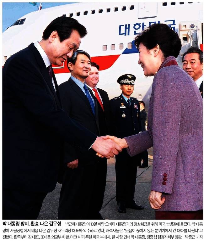 국민일보 동아일보 서울신문 중앙일보 등은 박근혜 대통령이 한·미 정상회담을 위해 미국으로 출국하기 직전 환송 나온 김무성 새누리당 대표와 악수하는 모습을 1면으로 전했다. 국민일보는 "지난달 말 추석연휴 기간 박 대통령이 유엔총회 참석차 출국할 때는 물론 유엔총회 참석 후 입국할 때도 공항에 나오지 않았다"고 덧붙였다.