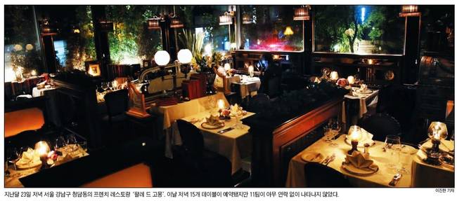 조선일보는 서울 강남구 청담동의 한 식당에 자리가 비어있는 모습을 1면으로 전하면서 "이날 15개 테이블이 예약됐지만 11팀이 아무 연락 없이 나타나지 않았다"고 설명했다. 조선일보는 예약을 해놓고 아무런 연락 없이 나타나지 않는 경우를 뜻하는 '노쇼(no-show)' 용어를 소개하면서 "전국의 식당, 미용실, 병원, 고속버스, 소규모 공연장 등 5개 서비스 부문 100개 업체를 조사한 결과 손님이 예약해 놓고 나타나지 않는 '예약 부도' 비율이 평균 15%로 나타났다"며 "이 같은 예약 부도로 발생하는 5개 서비스 부문의 매출 손실은 매년 4조5000억원에 달할 것으로 추산됐다"고 보도했다.