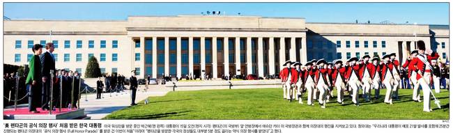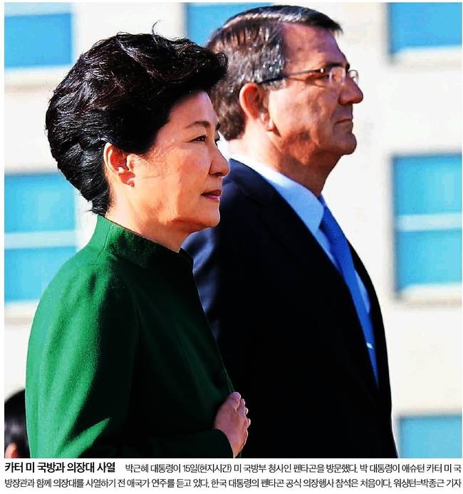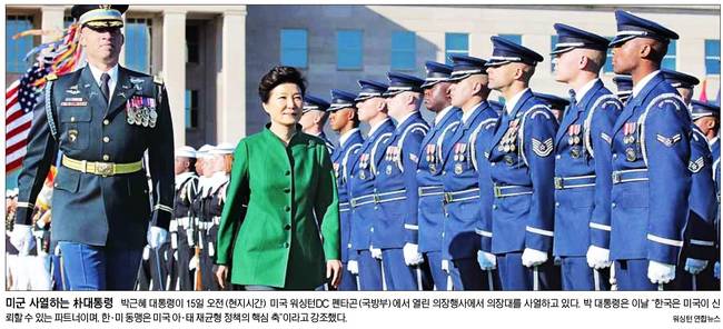 한·미 정상회담을 위해 미국을 방문 중인 박근혜 대통령이 15일 오전(현지시간) 미국 워싱턴DC 펜타곤(국방부)에서 열린 의장행사에서 의장대를 사열했다. 국민일보 동아일보 서울신문 세계일보 조선일보 중앙일보 한국일보 등 대부분의 종합일간지는 16일 이 모습을 1면 사진으로 실었다.