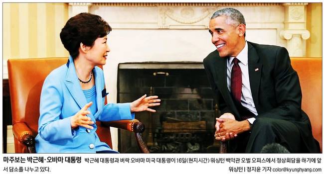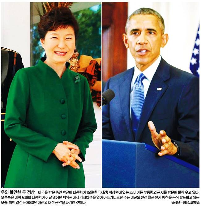 박근혜 대통령과 버락 오바마 대통령이 16일(현지시간) 미국 백악관에서 정상회담을 가졌다. 이날 양 정상은 '북한에 관한 한·미 공동성명'을 채택해 북핵 문제 등을 시급하고 확고한 의지를 통해 다루기로 합의했다.