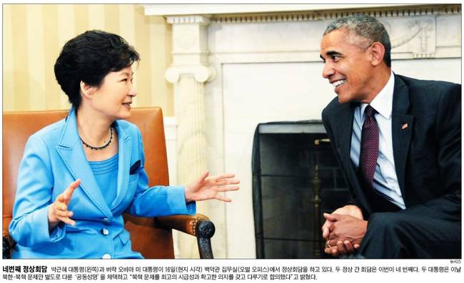 조선일보는 "한·미 정상이 16일 채택한 공동성명에 포함된 '최고의 시급성'을 갖고 북핵 문제를 다루겠다'는 표현은 지금까지 북핵 해결에 대한 미국의 의지 천명 중 가장 강력한 것이다. 최근 수년간 북핵 문제는 미국의 안보 어젠다에서 후순위로 밀려나 있는 것으로 평가받았다"며 "박 대통령은 이번 정상회담을 통해 미국을 다시 '무대 전면'으로 끌어내려 한 것으로 보인다"고 전했다.
