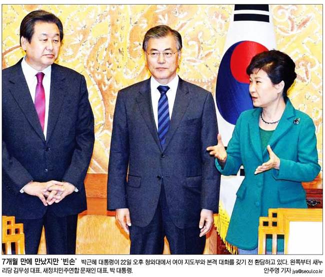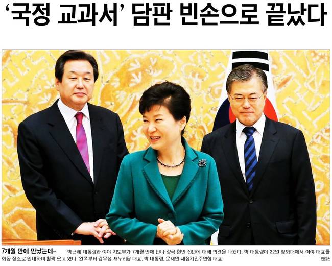 서울신문은 "역사 교과서 국정화를 비롯한 주요 현안에 대한 현격한 시각차만 재확인했다. 박 대통령과 여야 지도부가 허심탄회하게 의견을 교환함으로써 역사 교과서 국정화 추진에서 비롯된 정국 대치가 해소될지 관심을 끌었지만 회동이 '빈손'으로 끝남에 따라 남은 19대 정치국회는 험로가 예고됐다"며 "전체 회동 시간의 3분의1가량인 30분여 동안 역사 교과서 국정화를 둘러싼 격론이 이어졌다. 예상대로 정부·여당과 야당은 평행선을 달렸다"고 보도했다.