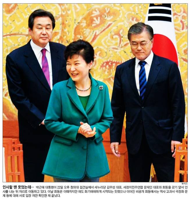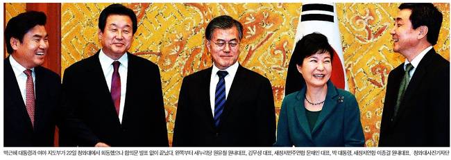 박근혜 대통령과 여야 지도부가 22일 청와대에서 만났다. 이날 박 대통령과 김무성 새누리당 대표, 원유철 원내대표, 문재인 새정치민주연합 대표, 이종걸 원내대표는 역사교과서 국정화 등 현안 등을 두고 충돌했다. 23일 대부분의 종합일간지는 '5인 회동' 모습을 1면 사진에 실었다.