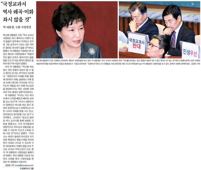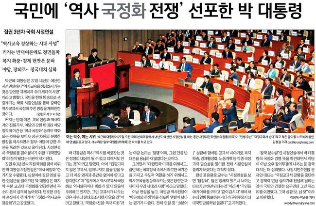 동아일보, 서울신문, 세계일보, 조선일보 등은 박근혜 대통령이 27일 국회 본회의장에서 열린 내년도 예산안 시정연설에서 연설하는 모습을 담았다. 박 대통령은 역사 교과서 국정화 논란과 관련해 "역사 왜곡이나 미화가 들어간 교과서가 나오는 것은 나부터 절대 좌시하지 않을 것"이라고 밝혔다.