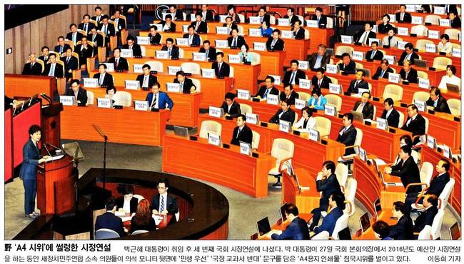 경향신문은 28일자 1면 사진에서 박근혜 대통령이 지난 27일 오전 국회 본회의장에서 내년도 예산안 시정연설을 하는 동안 새정치민주연합 의원들이 '민생우선' '국정교과서 반대'라고 적은 종이를 노트북에 붙은 채 연설을 듣고 있는 모습과 새누리당 일부 의원들이 박수를 치고 있는 모습을 담았다.