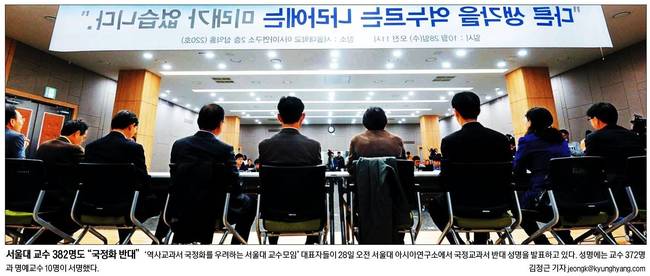 경향신문은 29일자 1면 사진에서 '역사교과서 국정화를 우려하는 서울대 교수모임'대표자들이 지난 28일 오전 서울대 아시아연구소에서 국정교과서 반대 성명을 발표하고 있는 모습을 싣었다. 이날 성명에는 교수 372명과 명예교수 10명이 서명했다.