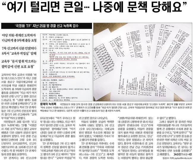 국민일보는 28일 단독 입수한 경찰 긴급범죄신고센터의 지난 25일 서울 종로구 국립국제교육원 '신고접수 녹취록'을 1면 사진으로 전했다.