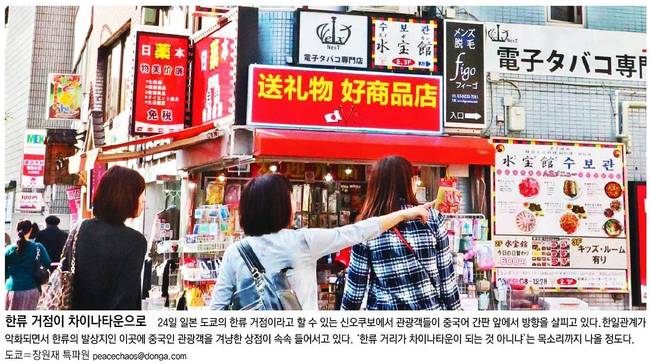 동아일보는 24일 일본 도쿄의 한류 거점이라고 할 수 있는 신오쿠보에서 관광객들이 중국어 간판 앞에서 방향을 살피고 있는 모습을 담았다. 한일관계가 악화되면서 한류의 발상지인 이곳에 중국인 관광객을 겨냥한 상점이 속속 들어서고 있다고 동아일보는 전했다.