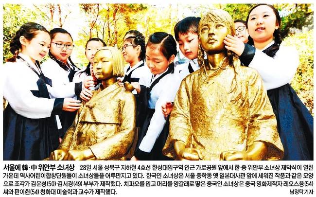 세계일보는 28일 서울 성북구 지하철 4호선 한성대입구역 인근 가로공원 앞에서 한-중 위안부 소녀상 제막식이 열린 가운데 역사어린이합창단원들이 소녀상들을 어루만지고 있는 모습을 전했다.
