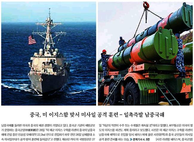 중앙일보는 남중국해를 둘러싼 미국과 중국의 패권 경쟁이 가열되고 있다는 소식과 함께 미 해국 이지스 구축함 라센이 남중국해 해역으로 진입할 당시 페이스북에 올린 사진과 중국 군인들이 미사일 공격 훈련 준비를 하는 모습을 함께 싣었다.