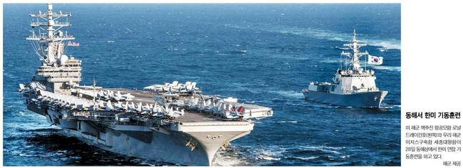 한국일보는 미 해군 핵추진 항공모함 로널드레이건호와 우리 해군 이지스 구축함 세종대왕함이 28일 동해상에서 한미 연합 기동훈련을 하는 모습을 담았다.