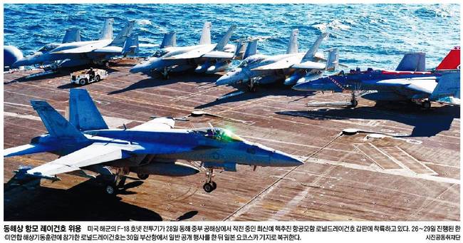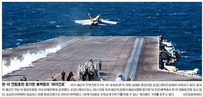 국민일보, 동아일보, 서울신문 등은 미국 해군의 주력 전투기 FA-18 슈퍼호넷이 29일 서남해 공해상 항공모함 로널드레이건호에서 이륙하는 장면을 싣었다.