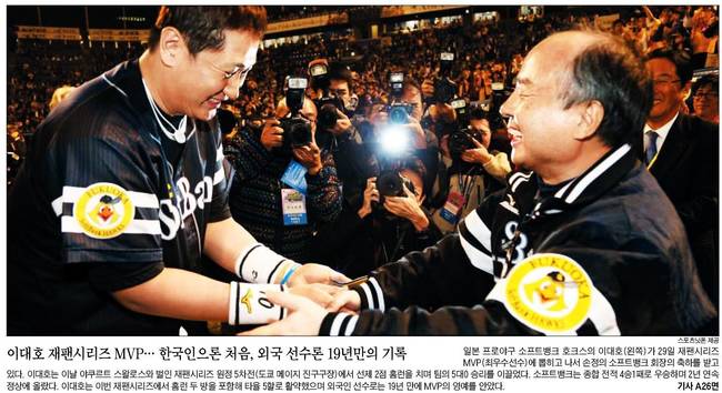 조선일보는 일본 프로야구 소프트뱅크 호크스의 이대호가 29일 재팬시리즈 MVP(최우수선수)에 뽑히고 나서 손정의 소프트뱅크 회장의 축하를 받고 있는 모습을 담았다.