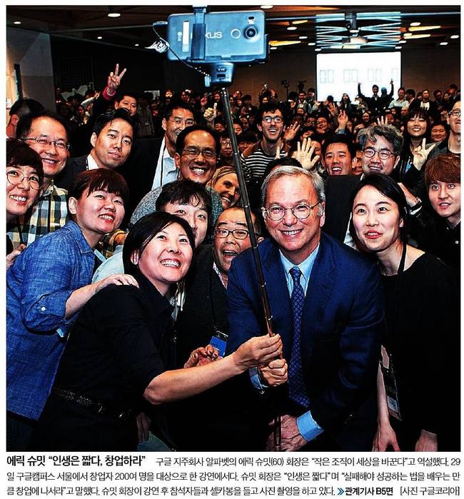 중앙일보는 구글 지주회사 알파벳의 에릭 슈밋 회장이 지난 29일 구글캠퍼스 서울에서 창업자 200여명을 대상으로 한 강연을 한 후 참석자들과 셀카봉을 들고 사진 촬영을 하는 모습을 담았다.