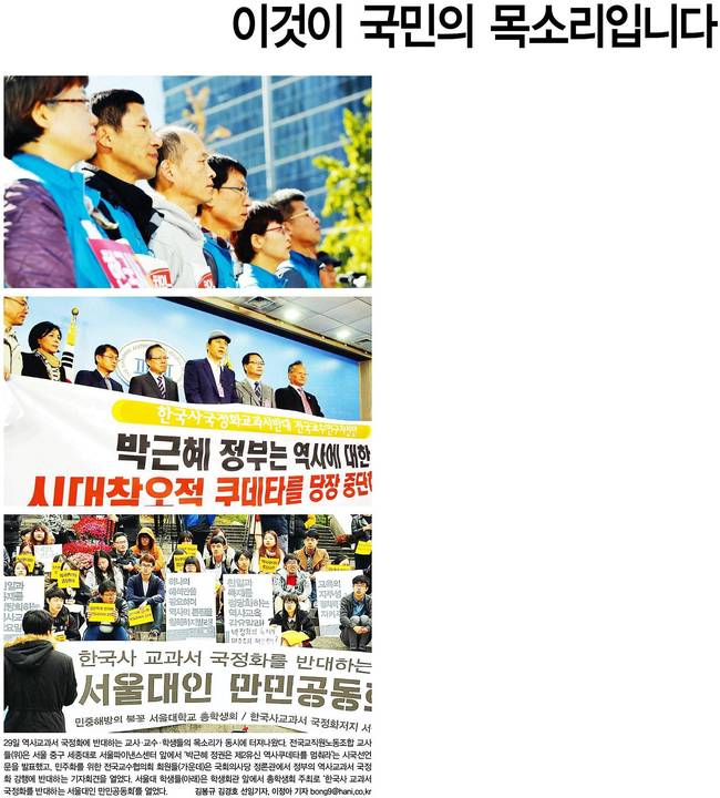 한겨레는 29일 전국교직원노동조합 교사들이 서울 중구 세종대로 서울파이낸셜센터 앞에서 '박근혜 정권은 제2유신 역사 쿠데타를 멈춰라'는 시국선언문을 발표하는 모습과 민주화를 위한 전국교수협의회 회원들이 국회의사당 정론관에서 정부의 역사교과서 국정화 강행에 반대하는 기자회견 모습, 서울대 학생들이 학생회관 앞에서 총학생회 주최로 '한국사 교과서 국정화를 반대하는 서울대인 만민공동회'를 개최한 모습을 담았다.
