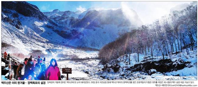 한국일보는 29일 중국 지린성을 통해 백두산 북파의 장백폭포를 찾은 관광객이 두툼한 외투를 껴입은 채 시월의 백두 설경을 거닐고 있는 모습을 전했다.
