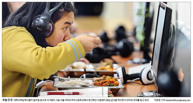 경향신문은 서울 여의도고등학교에서 한 3학년 수험생이 점심 급식을 먹으며 인터넷 강의를 듣고 있는 모습을 사진에 담고 ‘수능선물 서울대 독서등, SKY 노트 불티’라는 제목의 기사를 통해 “고득점 기원 학습용품이 인기를 끌고 있다”고 보도했다.