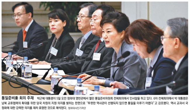 동아일보는 박근혜 대통령이 5일 오전 청와대 영빈관에서 열린 통일준비위원회 전체회의에 참석한 모습을 1면에 담았다. 동아일보는 “박 대통령이 남북 교류협력의 확대를 위한 당국 차원의 지원 의지는 밝히는 한편으로 ‘뚜렷한 역사관이 선행되지 않으면 통일을 이루기 어렵다’고 강조했다”고 보도했다. 동아는 이를 두고 역사 교과서 국정화에 대한 강력한 의지를 재차 표명한 것으로 해석했다.