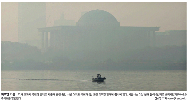 한겨레신문은 희뿌연 안개에 휩싸여 있는 국회의 모습을 1면에 담았다. 한겨레는 “역사 교과서 국정화 문제로 국회가 사흘째 공전 중”이라며 “이날 광화문 광장 앞에는 손팻말을 든 ‘에볼라 의사’가 국정화 반대 피켓 시위에 나섰다”고 보도했다.