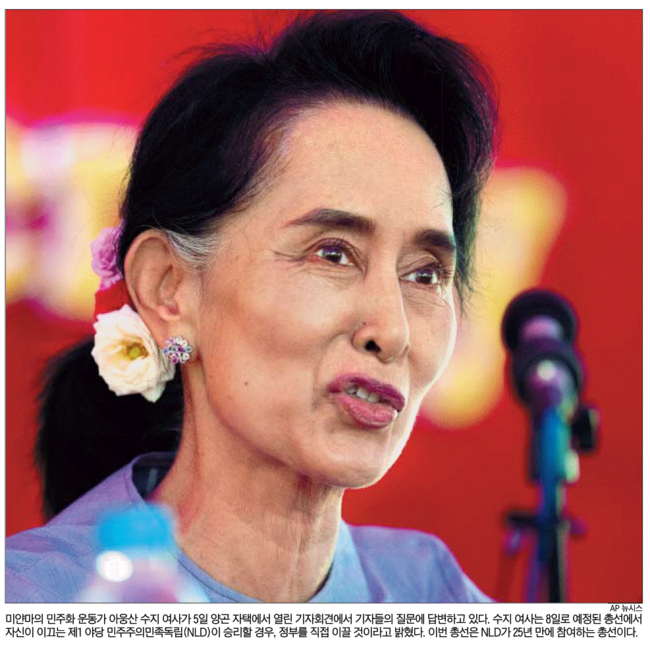 이날 조선일보는 총선을 앞둔 미얀마에서 제1야당인 민주주의민족동맹의 아웅산 수지 대표를 단독 인터뷰해 1면 사진에 실었다.