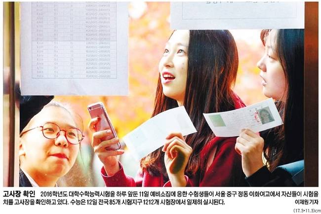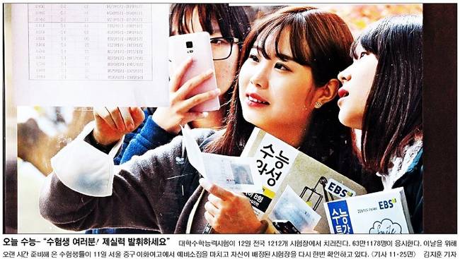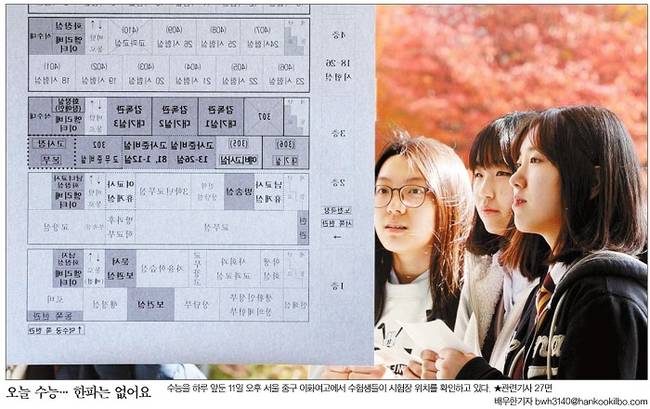 한국일보는 수학능력시험을 하루 앞둔 11일 자신의 시험 고사장을 확인하는 학생들의 모습을 1면 사진으로 선택했다. 한국일보는 관련기사에서 “11일 교육부와 한국교육과정평가원은 이번 수능은 지난해보다 9343명 줄어든 63만 1178명 수험생이 원서를 접수했다고 밝혔다. 응시자들은 오전 8시10분까지 입실을 마친 뒤 오전 8시 40분 1교시 국어영역을 시작으로 2교시 수학, 3교시 영어, 4교시 사회·과학·직업탐구, 5교시 제2외국어·한문 순으로 오후 5시까지 시험을 치른다”고 밝혔다.