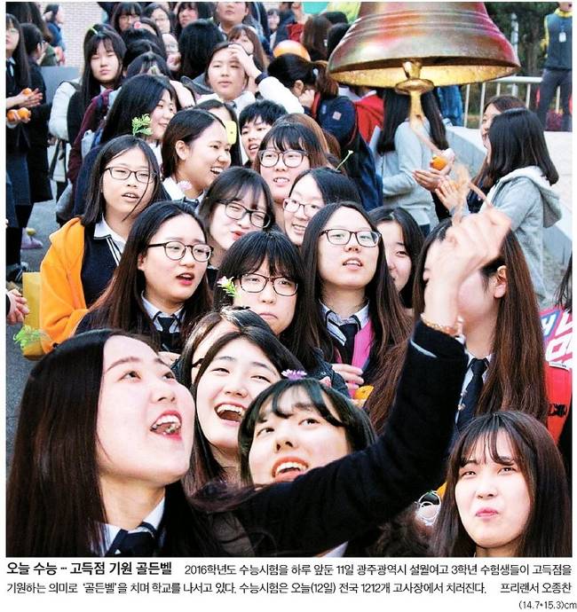 2016학년도 대학수학능력시험이 12일 실시된다. 전국 85개 시험지구 1212개 시험장에서 실시되는 이번 시험에는 수험생 63만 여명이 응시한다. 12일 상당수 주요 일간지들은 이 같은 소식을 담은 사진을 전면에 내걸었다.