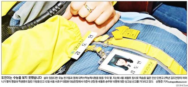 마침 이날은 세월호 관계자 15명에 대한 대법원 상고심 선고가 진행된 날이었다. 참사가 없었다면 단원고 학생들도 이날 시험에 응시했을 것이란 말이다. 13일 대다수 주요 일간지들은 이 같은 소식을 담은 사진을 전면에 내세웠다.