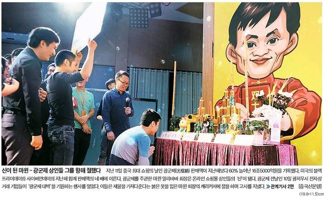 이어 ”행사를 주관한 중국 최대 전자상거래 업체 알리바바는 ‘11일 광군제에게 모두 912억 위안(약 16조4980억원)의 매출을 기록했다’고 12일 밝혔다. 지난해 매출보다 60% 늘어났다“면서 ”지난해 미국 블랙프라이데이와 사이버먼데이 두 행사를 합친 매출액의 4배에 이른다“고 보도했다.