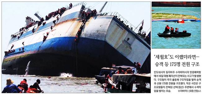 경향신문은 18일자 1면 사진기사에서 인도네시아 동자바주 수라바야시의 탄중페락항에서 16일 대형 페리선이 전복된 사고가 발생한 장면을 담았다.