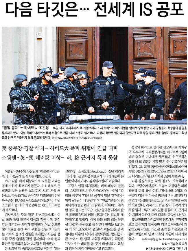 동아일보는 16일 미국 매사추세츠 주 케임브리지 소재 하버드대 메모리얼홀 앞에서 중무장한 미국 경찰들이 학생들의 출입을 통제하고 있는 모습을 담았다. 이날 하버드에서는 폭파 위협으로 긴급 대피 소동이 벌어졌다, 다행히 폭탄은 발견되지 않았지만 하루 종일 주요 건물 출입이 통제되고 학생들과 인근 주민들까지 테러 공포에 떨어야 했고 이 신문은 전했다.