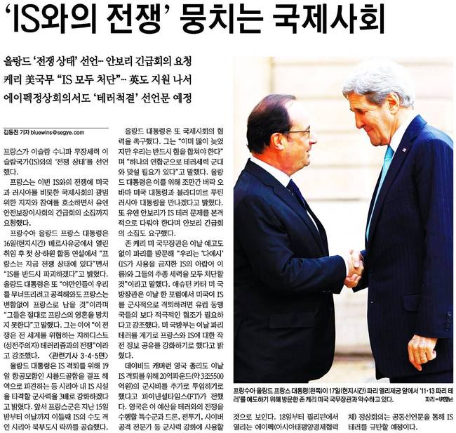세계일보는 프랑수아 올랑드 프랑스 대통령이 17일 파리 엘리제궁 앞에서 '11‧13 파리 테러'를 애도하기 위해 방문한 존 케리 미국 국무장관과 악수하는 장면을 실었다.