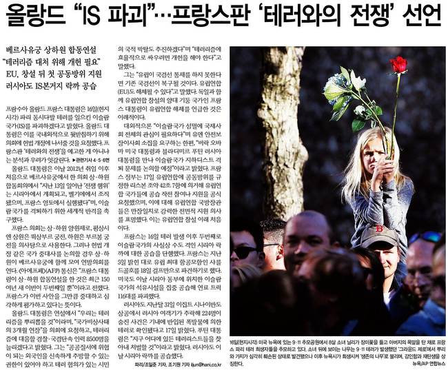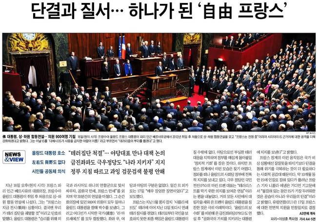 조선일보는 16일 프랑수아 올랑드 프랑스 대통령이 파리 인근 베르사유궁에서 2012년 취임 후 처음으로 상‧하원 합동연설을 갖은 장면을 담았다. 이날 올랑드 대통령은 "프랑스는 전쟁 중"이라며 시리아의 IS 근거지에 대한 공격을 더욱 강화하겠다"고 밝혔다. 또 그는 IS를 '다에시(IS가 사용을 금지한 아랍어 이름)'라고 부르면서 "테러리즘의 뿌리를 뽑겠다"고 했다.