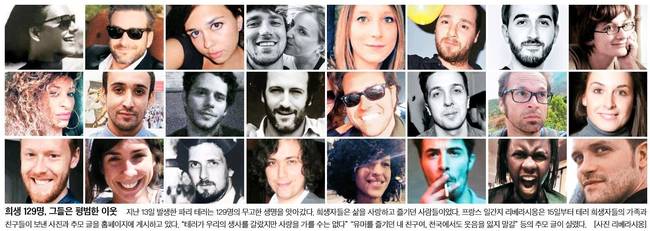 중앙일보는 지난 13일 발생한 파리 테러는 129명의 무고한 생명을 앗아갔다며 프랑스 일간지 리베라시옹이 15일부터 테러 희생자들의 가족과 친구들이 보낸 사진과 추모 글을 홈페이지에 게재한 장면을 담았다.