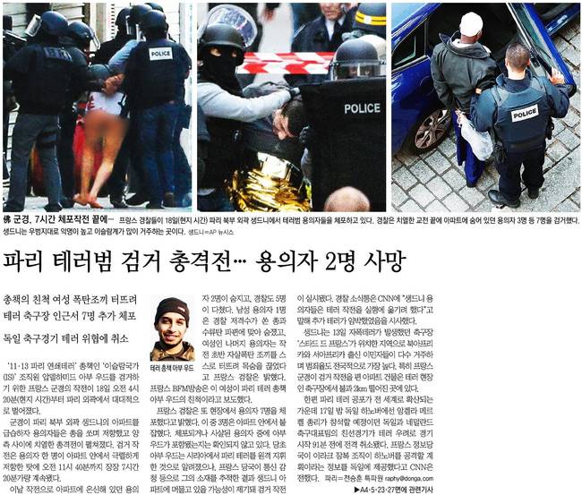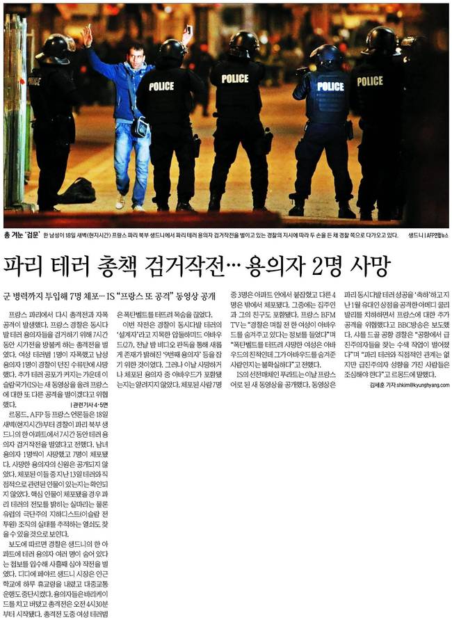 조선일보, 한겨레, 한국일보는 18일 파리 북부 생드니에서 전개된 테러 총책 압델하미드 아바우드 체포 작전 도중 얼굴을 가린 프랑스 경찰 대원이 테러 용의자 한 명을 제압하고 있는 모습을 담았다.