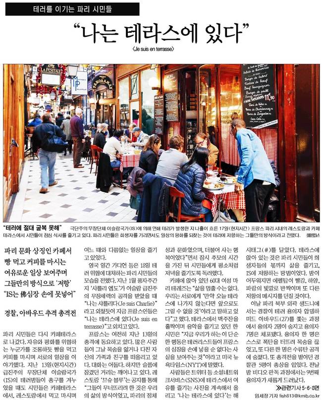 국민일보는 극단주의 무장단체 이슬람국가(IS)에 의해 연쇄 테러가 발생한 지 나흘이 흐른 17일(현지시간) 프랑스 파리 시내의 레스토랑과 카페 테라스에서 점심 식사를 즐기고 있는 장면을 전했다.