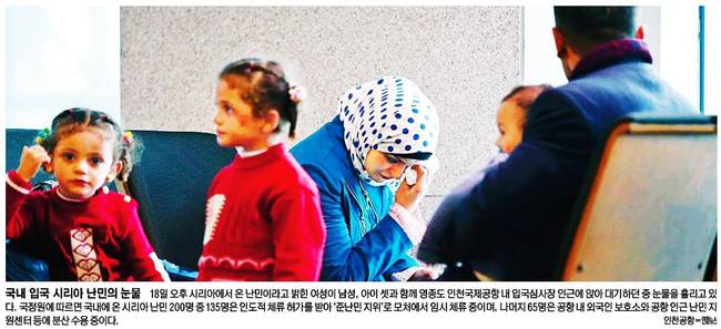 세계일보는 18일 오후 시리아에서 온 난민이라고 밝힌 여성이 남성, 아이 셋과 함께 영종도 인천국제공항 내 입국심사장 인근에 앉아 대기하던 중 눈물을 흘리고 있는 모습을 전했다.