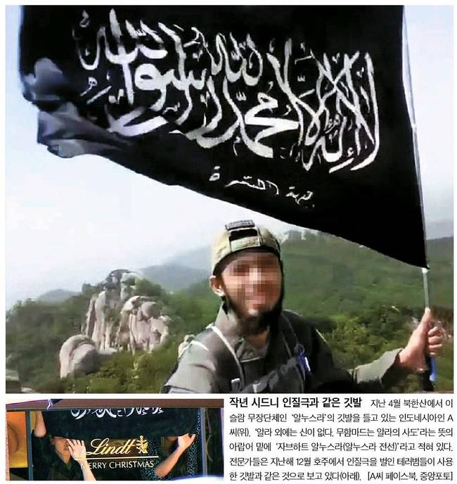 중앙일보는 지난 4월 북한산에서 이슬람 무장단체인 '알누스라'의 깃발을 들고 있는 인도네시아인 A씨의 사진을 실었다.