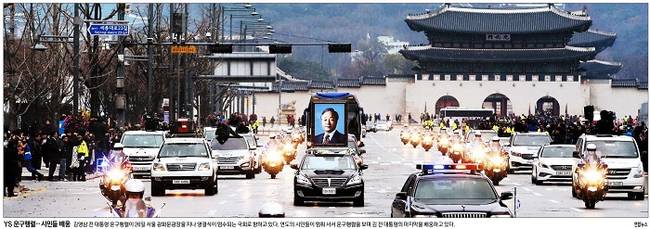 영결식이 끝나고 국회를 나온 운구행렬의 모습을 1면 사진으로 전한 신문도 있었다. 동아일보는 “영결식이 끝난 뒤 YS의 운구행렬은 46년간 거주했던 서울 상도동 사저와 대통령 기념도서관을 들렀다”며 “마지막으로 YS는 동작동 국립서울현충원에 안장됐다. 황교안 국무총리는 조사에서 ‘김 전 대통령이 염원했던 평화롭고 자유롭고 번영하는 나라를 만드는 것이 오늘의 우리들이 해야 할 몫’이라고 강조했다”고 보도했다.